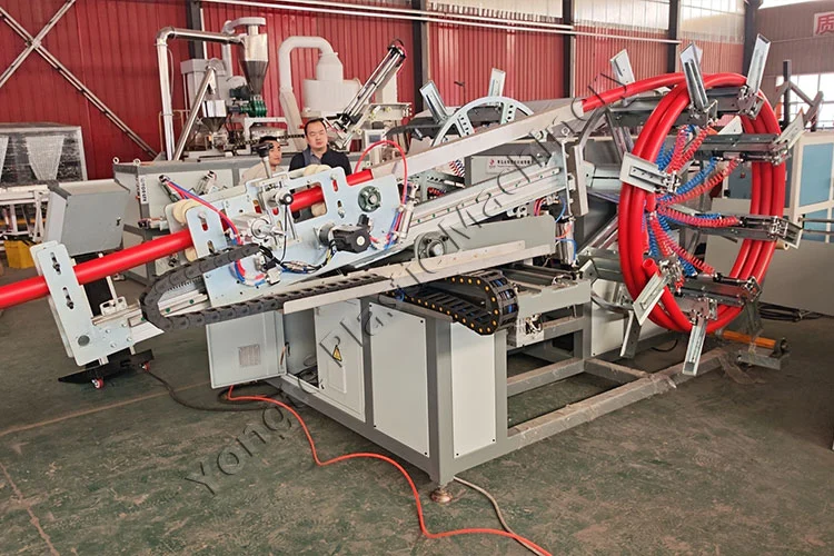 Το 2025, παραδώσαμε με επιτυχία δύο προσαρμοσμένα σετ αυτόματων μηχανών περιέλιξης σωλήνων πολυαιθυλενίου σε μια κορυφαία επιχείρηση επεξεργασίας πλαστικών στην Αργεντινή. Ο πελάτης απαιτούσε λύσεις περιέλιξης υψηλής απόδοσης για να ταιριάζουν με τις πρόσφατα επεκτεινόμενες γραμμές εξώθησης σωλήνων πολυαιθυλενίου υψηλής ταχύτητας. Η παραγγελία περιελάμβανε δύο εξειδικευμένες μονάδες: μια μηχανή αυτόματης περιέλιξης διπλού σταθμού βελτιστοποιημένη για σωλήνες διαμέτρου 15-32 mm και ένα άλλο μοντέλο υψηλής χωρητικότητας σχεδιασμένο για διαμέτρους 20-63 mm. Αυτά τα μηχανήματα ενσωματώνονται άψογα με τις γραμμές εξώθησης σωλήνων πολυαιθυλενίου υψηλής ταχύτητας για να τυλίγουν αυτόματα τους σωλήνες σε ομοιόμορφους κυλίνδρους. Εξοπλισμένο με σύστημα αυτόματης μέτρησης μήκους, το μηχάνημα ενεργοποιεί την αυτόματη κοπή και μεταφορά σταθμού μόλις επιτευχθεί το μήκος-στόχος. Ταυτόχρονα ασφαλίζει το έτοιμο ρολό και ενεργοποιεί έναν συναγερμό για τη συσκευασία, παρέχοντας μια πλήρως αυτοματοποιημένη λύση περιέλιξης. Οι αυστηρές εργοστασιακές δοκιμές πριν από την αποστολή εξασφάλισαν σταθερή επιτόπια λειτουργία μετά την παράδοση.