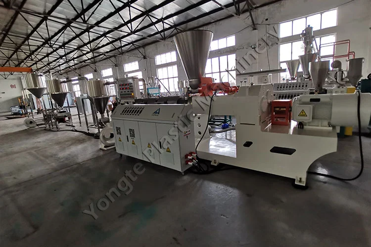 Το 2024, κατασκευάσαμε μια προσαρμοσμένη μηχανή σφαιροποίησης σύνθετων PVC για έναν Πολωνό πελάτη, ειδικά σχεδιασμένη για την παραγωγή κόκκων κύριας παρτίδας PVC από ανακυκλωμένο PVC και πληρωτικό CaCO3. Η περιεκτικότητα πλήρωσης CaCO3 μπορεί να ρυθμιστεί ευέλικτα μεταξύ 40% και 80% για να ευθυγραμμιστεί με τις προδιαγραφές παραγωγής του πελάτη. Τα βασικά εξαρτήματα περιλαμβάνουν έναν αυτόματο τροφοδότη, έναν κωνικό εξωθητήρα διπλής βίδας SJSZ80/156 (μοτέρ 75 kW με μετατροπέα συχνότητας ABB, που καταναλώνει ~ 50 KW κατά τη σταθερή λειτουργία), μια μήτρα θερμής σφαιροποίησης για ομοιόμορφη κοπή κόκκων και ένα σύστημα ψύξης τριών σταδίων και ταχείας ψύξης από ανοξείδωτο χάλυβα 304. Το μηχάνημα επιτυγχάνει παραγωγική ικανότητα 300-400 kg/ώρα και είναι κατασκευασμένο για συνεχή λειτουργία 24/7 με μηδενικό χρόνο διακοπής λειτουργίας. Η εγκατάσταση ήταν απρόσκοπτη, με την υποστήριξη της ομάδας ειδικών της Yongte, η οποία παρείχε βοήθεια από άκρο σε άκρο. Μετά την εγκατάσταση, η επιτόπια εκπαίδευση ενδυνάμωσε το προσωπικό του πελάτη να χειρίζεται τον εξοπλισμό άρτια, ενώ η απομακρυσμένη τεχνική υποστήριξη μέσω βίντεο καθοδήγησης εξασφάλισε την άμεση επίλυση τυχόν προβλημάτων, διατηρώντας αδιάκοπη παραγωγή και κορυφαία απόδοση.